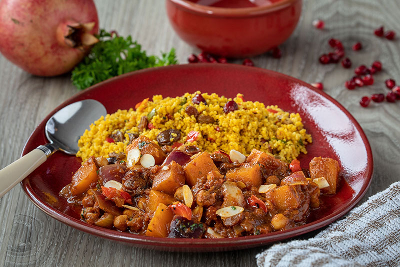 Moroccan spiced vegetable tagine made with squash, chickpeas, cranberry and sultanas flavoured with cumin and cinnamon.